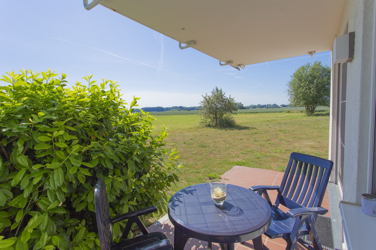Gemütliche Ferienwohnung (ca. 55 m²) für 2 Personen im Erdgeschoss der Doppelhaushälfte mit direktem Zugang über die Terrasse zum Grundstück, das sich bis zum Bodden erstreckt. Unverbauter Boddenblick!